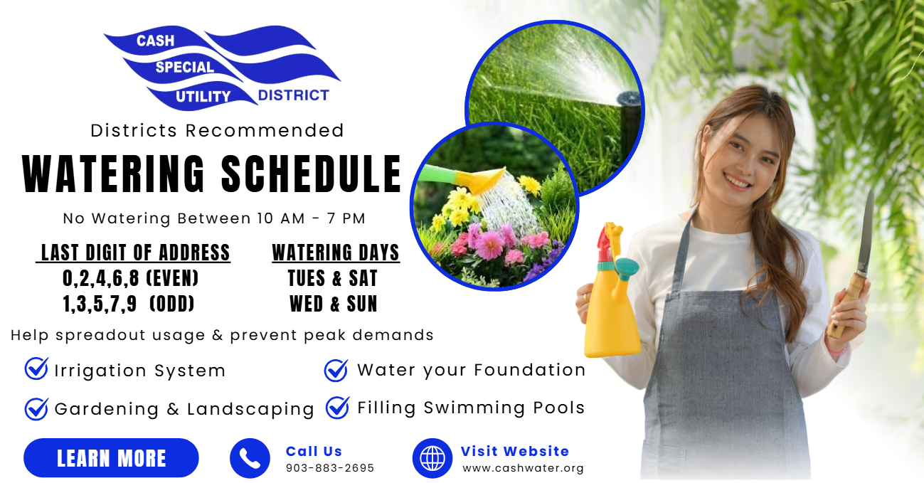 By developing practical water usage practices now, citizens can help reduce the likelihood of Cash SUD needing to implement any provisions of it's Water Resource & Emergency Management Plan, as well as save money on their water bill.